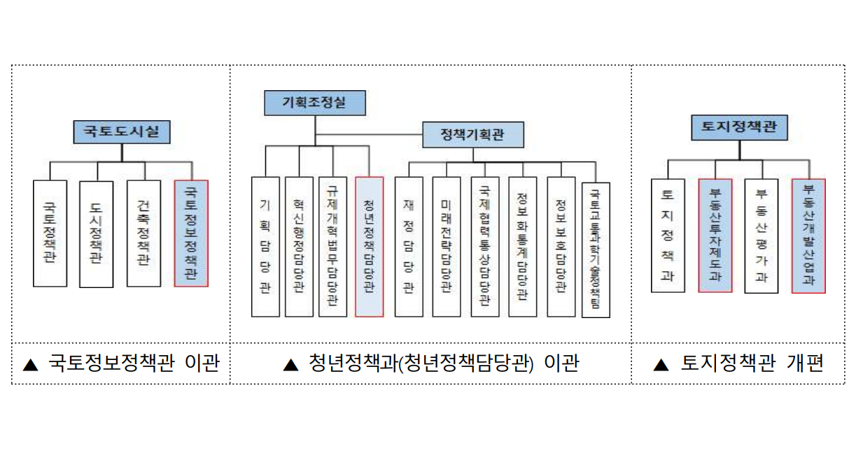 □ 아울러, 정책환경 변화에 대응하여 국토정보정책관과 청년정책과의 소관을 각각 국토도시실과 기획조정실로