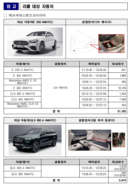□ 첫째, 메르세데스벤츠코리아㈜에서 수입, 판매한 E 350 4MATIC 등 7개 차종 31,195대는 12V 배터리의 고정 불량으로 차량 충돌 시 전원 연결부가 분리되고, 이로 인해 비상 경고등, 차문 자동 잠금 해제 장치 등이 작동되지 않을 가능성이 확인되어 자발적으로 시정조치(리콜)에 들어간다.