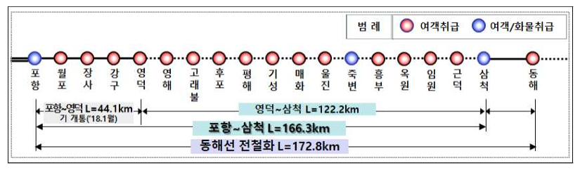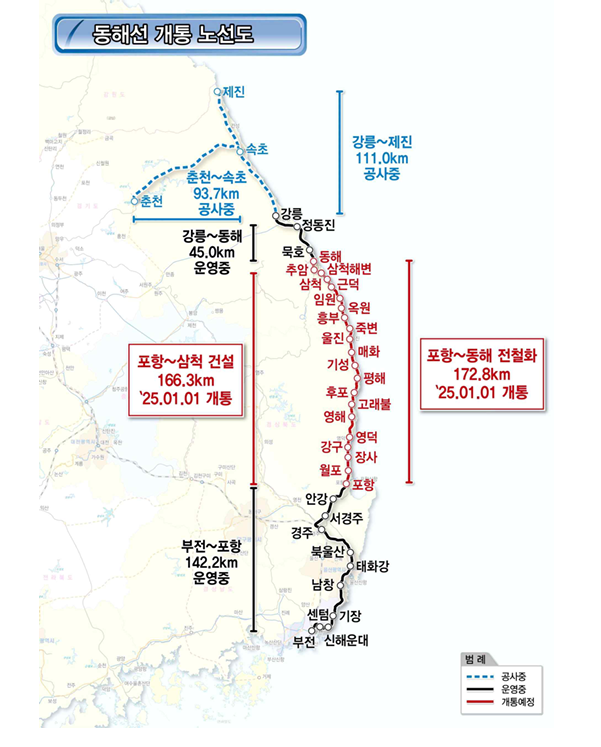 포항∼영덕 44.1km 개통(`18.1월), 영덕~삼척 122.2km 개통(‘25.1.1)되었고